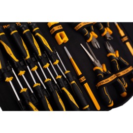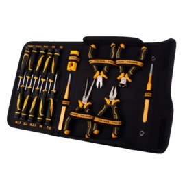 Набір прецизійних інструментів Tolsen на 17 предметів — ідеальний вибір для точних робіт у сфері електроніки, годинникової справи, ремонту окулярів, мобільної техніки та інших дрібних пристроїв. У комплекті: різні викрутки, пінцети, інструменти для розбирання та збирання.