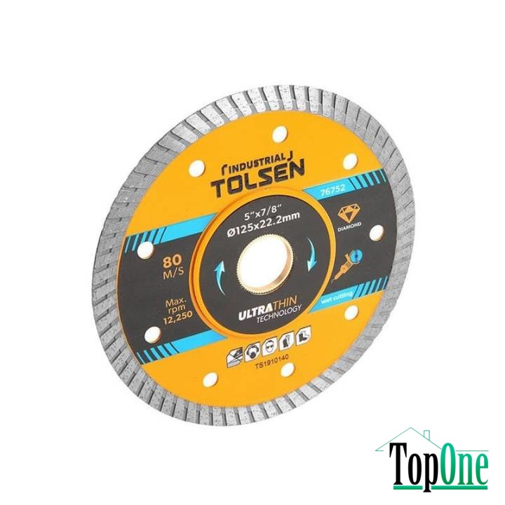 Ультратонкий алмазний диск Толсен серії ПРОФІ із турбо-сегментом, діаметром 125 мм і посадковим отвором 22,2 мм. Висота сегмента — 8 мм, товщина диска — 1,4 мм. Ідеальний для швидкого та точного різання керамічної плитки, керамограніту, кахлю, а також каменю та бетону з мінімальною кількістю відколів.