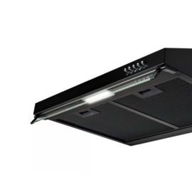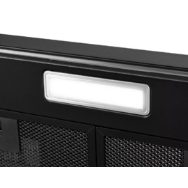 Корпус з чорного металу виглядає сучасно і лаконічно. Скляний козирок додає вишуканості і легкості формі витяжки. Кнопки керування зроблені з якісного пластику, міцні і тактильно приємні. Чорні алюмінієві фільтри доповнюють дизайнерськи привабливий вигляд й легко знімаються для чищення.