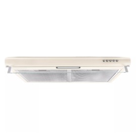 Корпус витяжки виготовлений зі сталевого листа з матовим порошковим фарбуванням, що забезпечує зносостійкість і легкий догляд. Скляний козирок не тільки додає легкості дизайну, а й ефективно захищає фільтр від крапель жиру. Бежевий колір корпусу чудово поєднується з пастельною або дерев’яною кухонною палітрою.