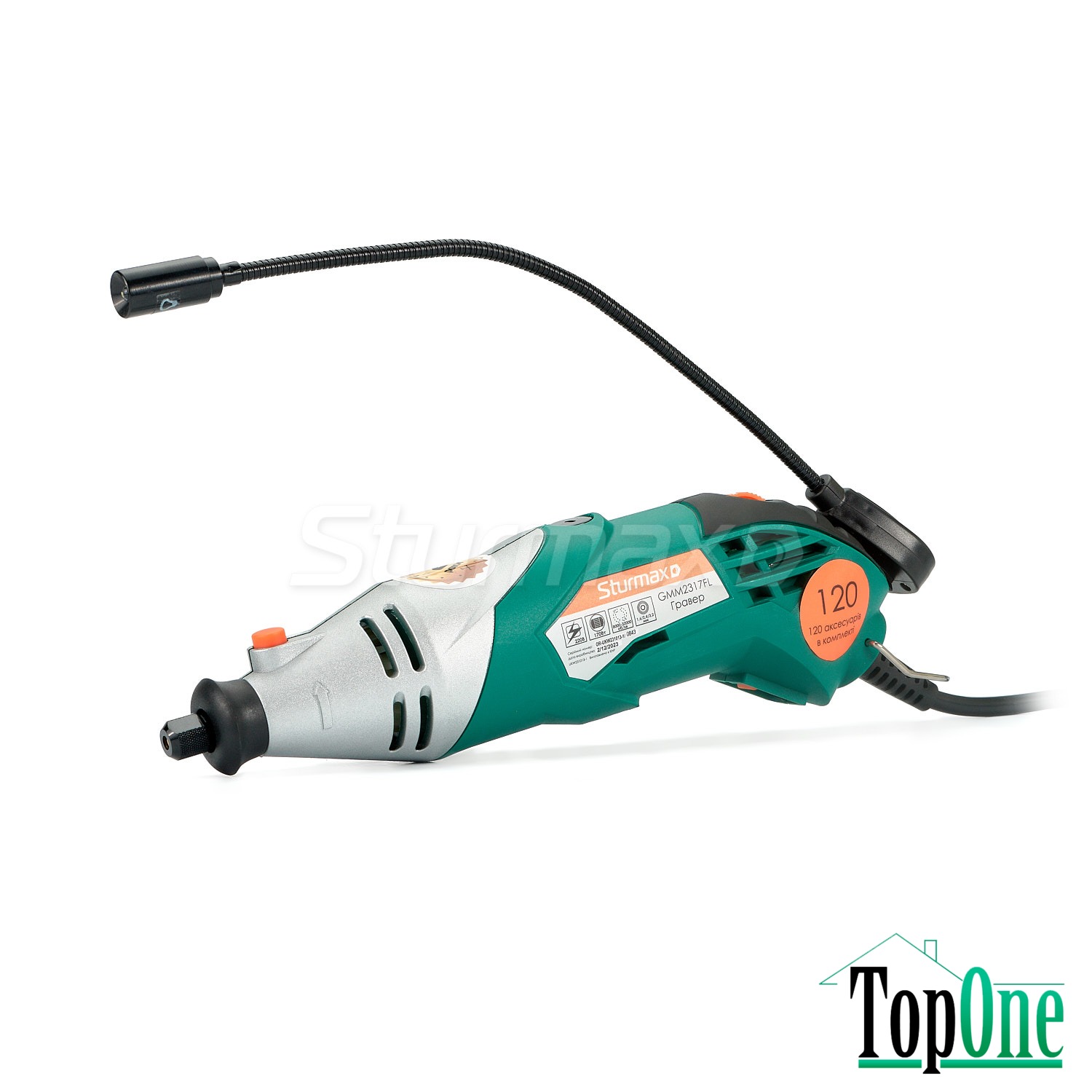 Sturmax GMM2317FL – компактний та ергономічний електричний гравер – призначений для шліфування, свердління, полірування, фрезерування, різання, гравіювання, очищення різних поверхонь. Підходить для роботи з деревом, металом, склом, каменем, керамікою. Модель оснащена функцією електронного регулювання обертів, завдяки якій користувач може налаштувати оптимальну швидкість обертання оснастки у широкому діапазоні від 8000 до 32000 об/хв. Для легкої та зручної заміни оснащення передбачена можливість блокування валу шпинделя. Зручність роботи в умовах недостатнього освітлення забезпечує штатне LED підсвічування, встановлене на гнучкій штанзі. Наявність функції швидкого доступу до щіток дозволяє проводити їх заміну без необхідності розбирання корпусу інструменту. Модель Sturmax GMM2317FL отримала розширену базову комплектацію, куди входять: метровий гнучкий вал, що сприяє ефектному використанню пристрою в місцях із утрудненим доступом, три цанги різних діаметрів (1.6/2.4/3.2 мм), для різних видів робіт, набір аксесуарів зі 120 одиниць, що значно розширює функціональність інструменту, а також міцний чохол, для зручності зберігання та транспортування.