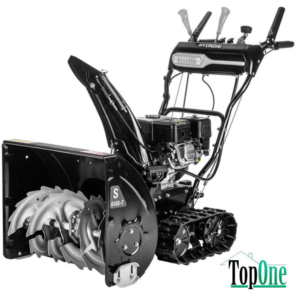 Снігоприбирач Hyundai S 6165-T додатково оснащується фарою, завдяки чому можна працювати навіть у темну пору доби. Маневреність та оптимальна прохідність у складних погодних умовах можлива завдяки наявності гусеничного приводу. Двигун має захисний кожух.