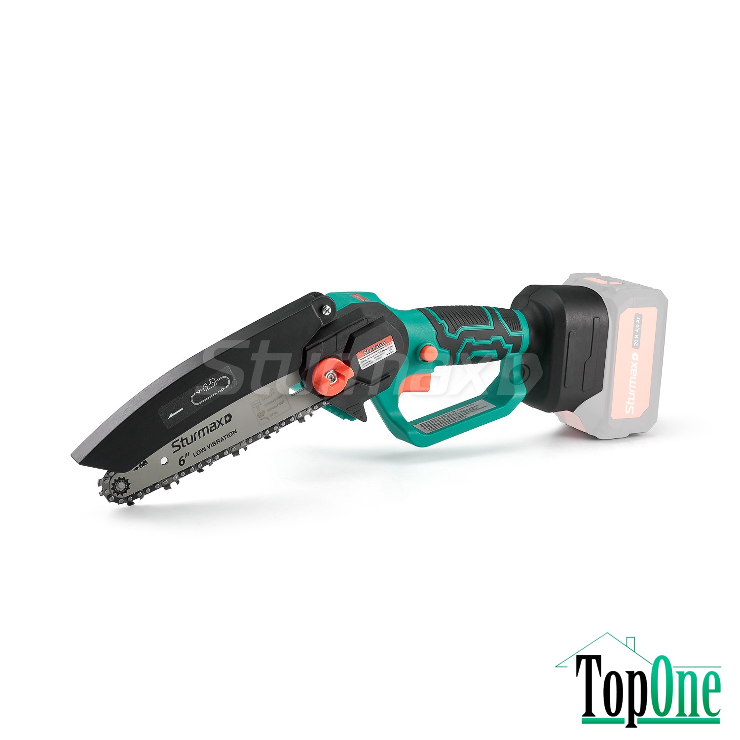 Sturmax CCM9901CR – акумуляторна ланцюгова міні-пила лінійки інструменту під єдину 20В акумуляторну платформу Sturmax Cordless Range. Пила має чудову ергономіку, а завдяки компактним габаритам та невеликій масі, маневрена та легка у використанні, в тому числі, під час робіт в умовах обмеженого простору. Корпус виконаний з якісного ударостійкого пластику та надійно захищає інструмент від можливих механічних пошкоджень під час експлуатації. Модель оснащена продуктивним 20В електромотором та шестидюймовою (150мм) пильною гарнітурою – відмінно підійде для обрізання тонких гілок, формування крони дерев та виконання невеликих садових або побутових завдань. Для безпеки користувача інструмент обладнаний захистом від випадкового ввімкнення.