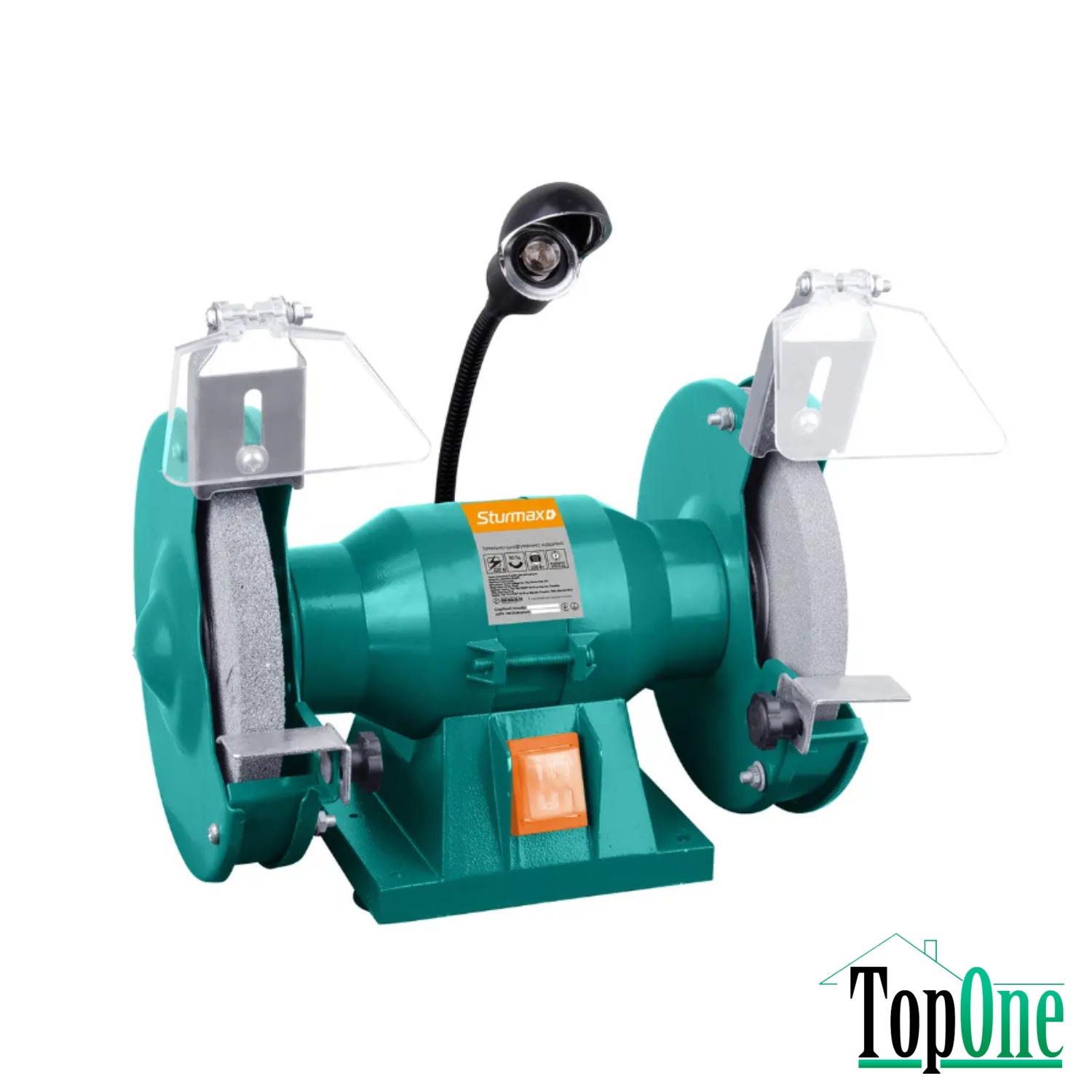 Sturmax BGM6015L – універсальний точильно-шліфувальний верстат –призначений для широкого спектру робіт: заточування, шліфування, зняття іржі, надання деталям необхідної форми і т.д. Модель має помірні габаритні розміри, що гарантує зручність під час її транспортування i дає можливість розмістити інструмент навіть в умовах обмеженого простору. При необхідності пристрій можна зафіксувати до робочої поверхні – для цього на станині передбачені отвори кріплення. Верстат оснащений надійним асинхронним двигуном потужністю 280 Вт і має низькі показники по шуму, вібрації та нагріванню. Комплектується двома абразивними колами з сірого електрокорунду діаметром 150 мм і товщиною 16 мм, з різним типом зернистості, що дозволяє використовувати верстат як для грубих обдирних, так і для чистових заточувальних операцій. Для більшої зручності користувача конструкцією передбачена можливість безінструментального (за допомогою барашкових гайок) регулювання опорних кронштейнів – це дозволяє при необхідності швидко та легко встановити упор для виробу, що заточується під потрібним кутом. Завдяки наявності великих та міцних іскрозахисних екранів з полікарбонату оператор надійно захищений від іскор та металевої стружки та може контролювати робочий процес, без ризику отримання випадкових травм. Наявність потужної лампи підсвічування робочої зони, встановленої на гнучкій основі, дозволяє ефективно використовувати інструмент навіть в умовах недостатнього зовнішнього освітлення.