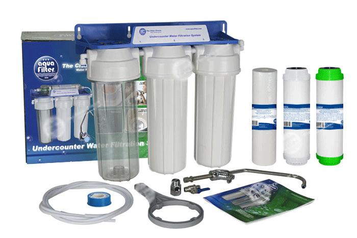 FUCS-FP3-K1 - система очистки воды под кухонную мойку. В комплект входят картридж CSSP-FCPS5 (удаляет песок, ржавчину, ил и другие механические загрязнения более 5 µm), умягчающий и обезжелезывающий картридж CFUM-FCCST2 (cнижает концентрацию железа, умягчает воду, заменяя ионы кальция и магния на ионы натрия) и картридж с активированным углём из скорлупы кокосовых орехов, засыпкой KDF® и с полипропиленовым волокном CFUM-FCCBKDF (удаляет сероводород, хлор, пестициды, фенол, бензол, cнижает концентрацию тяжёлых металлов: свинец, арсен, ртуть, кадмий).