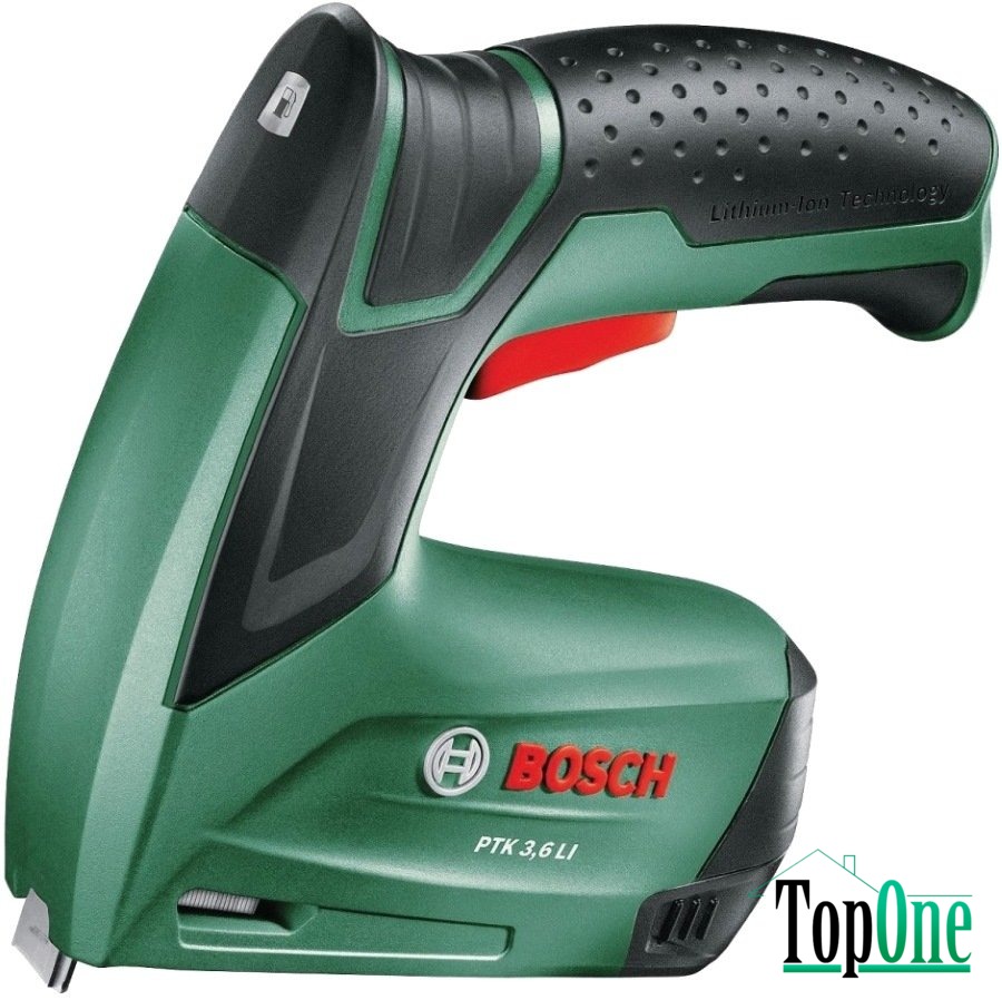 Легкий (0,8 кг), компактний, зручний степлер Bosch PTK 3,6 В Li-Ion для кріплення до м'яких, таких як деревина, тканини, шкіри, картону, плівок, ізоляційного матеріалу. Не підходить для кріплення обшивки стін та стелі.