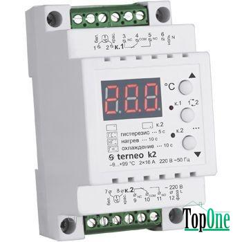 Terneo k2 — двухканальный терморегулятор с настраиваемым режимом работы (нагрев / охлаждение). Можно отдельно управлять двумя зонами нагрева, или двумя зонами охлаждения, или одной зоной нагрева и одной зоной охлаждения. Если датчики обеих каналов разместить в одном месте и на один канал подключить нагреватель, а на другой охладитель, то температуру можно поддерживать в нужных пределах круглый год.