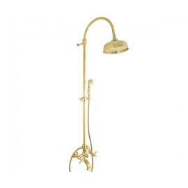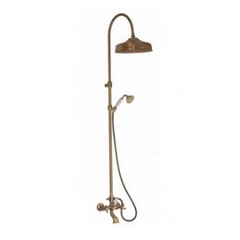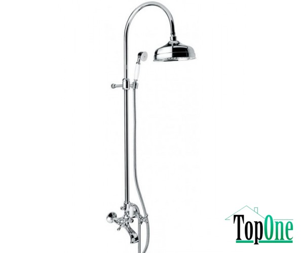 Смеситель оснащён двумя крестообразными вентилями смешивания и регулирования холодной – горячей воды с переключением ванна/душ. Корпус смесителя изготовлен из экологически чистого материала (латунь). В комплект входит душевая стойка, верхняя лейка и ручная лейка.