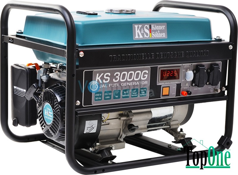 Газобензинові генератори ТМ «Könner & Söhnen» серії DUAL FUEL на сьогоднішній день найбільш популярні серед покупців через свою економічність та екологічність. Ви можете використовувати генератор як на бензині, так і на зрідженому газі (пропан-бутан). Експлуатація генератора на газу підвищує моторесурс двигуна. Все необхідне для підключення балону йде в комплекті: генератор оснащений регулятором нульового тиску, шлангом з понижуючим редуктором; необхідно тільки під’єднати генератор до Вашого газового балону. Генератор не призначений для підключення до газової магістралі. При необхідності газобензинові моделі легко перемкнути на роботу на бензині. Потужний одноциліндровий 4-х тактний двигун K&S з повітряним охолодженням забезпечує стабільну та надійну роботу генератора.