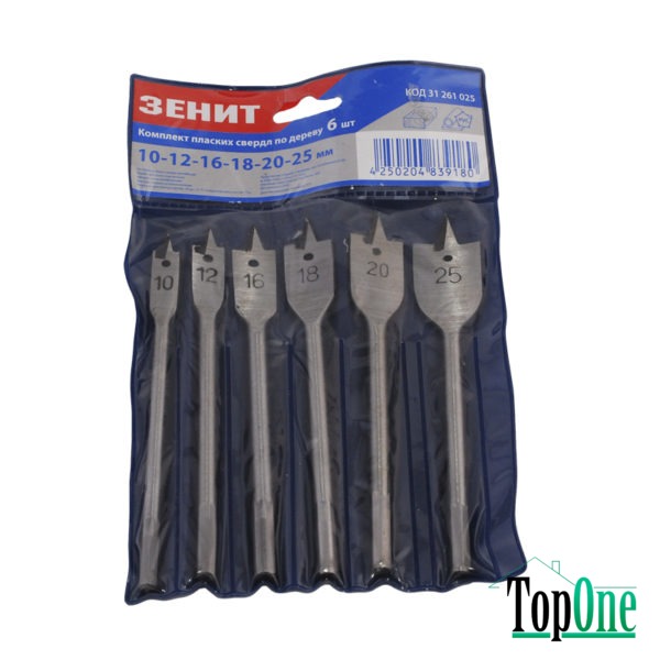 Набір свердлу Зеніт по дереву 31261025 10, 12, 16, 18, 20, 25мм 6шт - Для ефективного, швидкого свердління отворів різного діаметру в ДСП, фанері, будь-яких порід деревини, успішно використовуються спеціальні пір'яні свердла. У роботі з електро та ручним інструментом можна використовувати набір свердел по дереву. Крім цього, такі свердла підходять для глибокого типу свердління зі спеціальним подовжувачем. Даний набір пір'яних свердлів по дереву відрізняється винятковими характеристиками через використання у виробництві інструментів високовуглецевої сталі.