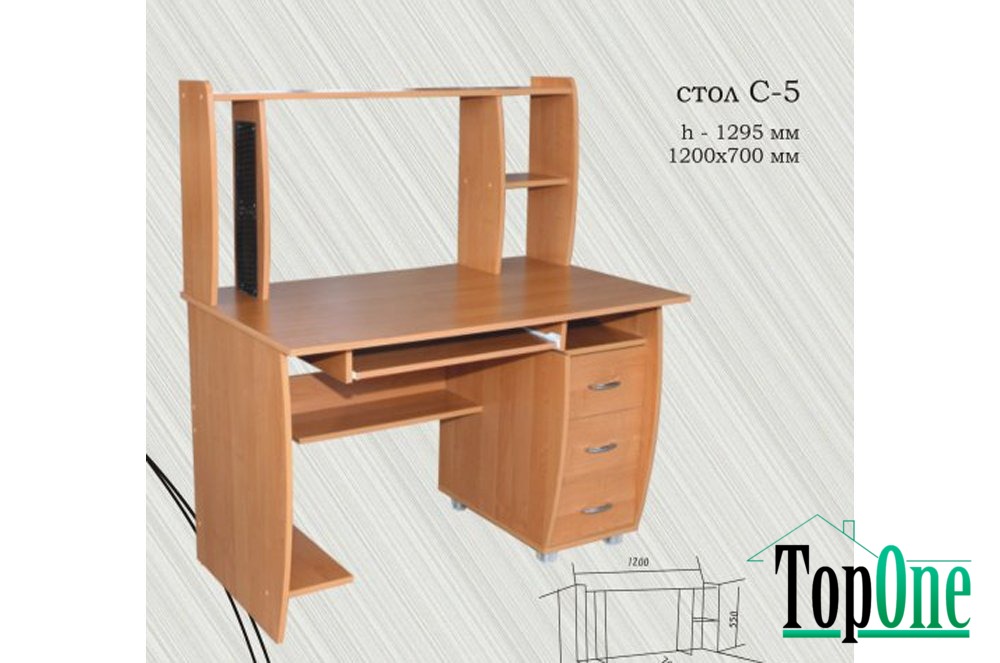 Компьютерный стол "С-5" поможет решить проблему эргономичного распределения пространства, предоставив тем самым максимальные удобства и комфорт для работы на ПК. Полка под клавиатуру на телескопических направляющих. Стол имеет специальную полку для системного блока. Имеются специальные полочки под диски. Наличие вместительной тумбочки с тремя выдвижными ящиками для вещей. Стол эконом-класса. Данная модель компьютерного стола выполнена из прочного ДСП в характерном современном стиле. Компьютерный стол "С-5" прекрасно подойдет как для домашнего использования, так и для офисного. В нем есть весь необходимый функционал, который обеспечит максимально комфортную работу.