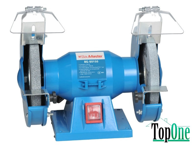Дводисковий точильний верстат BauMaster BG-60150, призначений для операцій ручного шліфування, таких як заточування ручного інструменту, видалення надлишків металу, а також вирівнювання металевих поверхонь, за допомогою грубої та остаточної шліфування з використанням шліфувальних дисків різного призначення та зернистості. Модель обладнана асинхронним електродвигуном потужністю 200 Вт, який розганяє два шліфувальні диски діаметром 150 мм и товщиною 16 мм до швидкості 2950 оборотів в хвилину.