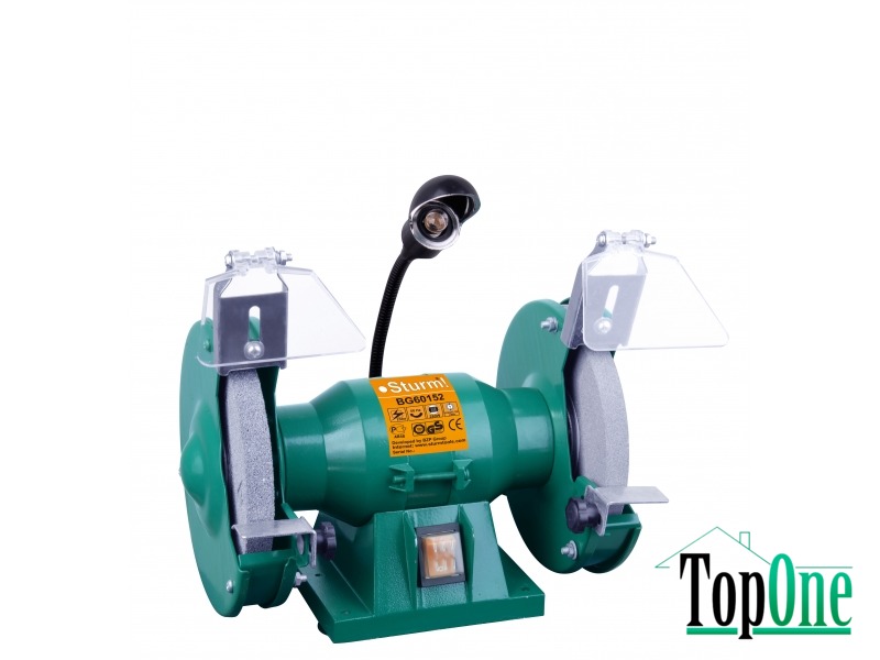 Точильний верстат Sturm BG6015L - побутовий прилад для заточування різних різальних інструментів. Верстат оснащений двома пиляльними колами: один служить для чорнової обробки, другий - для чистової. Комплектується лампою на гнучкій ніжці для кращого освітлення робочого місця. Кнопка включення захищена від пилу для запобігання короткому замиканню. Передбачені прозорі пластикові екрани для захисту оператора від іскор. Потужність - 280Вт.