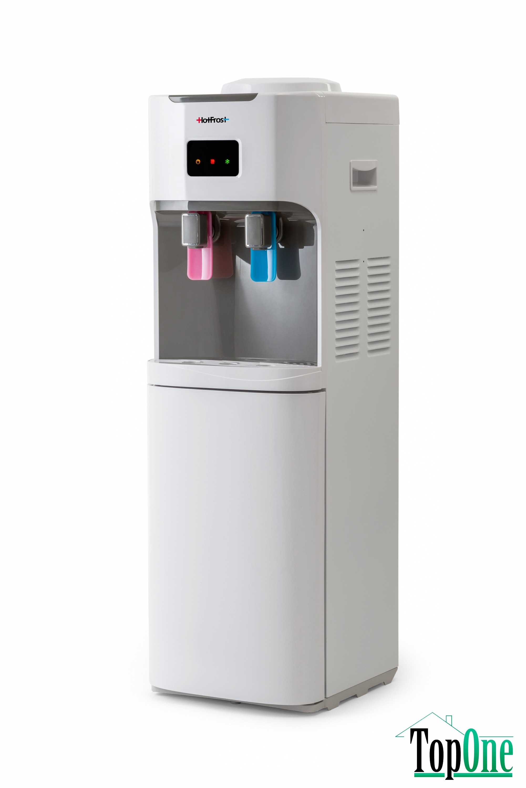 HotFrost V115 оснащений компресорною системою охолодження, що робить його повнофункціональним апаратом. Він відрізняється високою продуктивністю - до двох літрів холодної води на годину, і підходить для установки в офісах з численним персоналом. При цьому температура в приміщенні не впливає на рівень охолодження води. Збільшена потужність нагріву робить цей девайс набагато продуктивніше, адже він здатний нагрівати до шести літрів води на годину.
