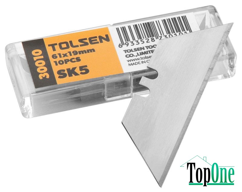 Лезо трапеція TOLSEN Профі 10 шт. (30010) виготовлені з швидкорізальної сталі SK5. Запакований у пластмасову коробку з кольоровою наклейкою. Використовується для розрізання паперу, ПВХ тощо. У комплекті 10 однакових лез розміром 61х19х0.6мм.