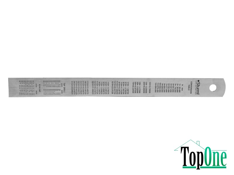 Лінійка металева 150мм, таблиця корисної інформації вибита на звороті лінійки, антикорозійне лакове покриття.