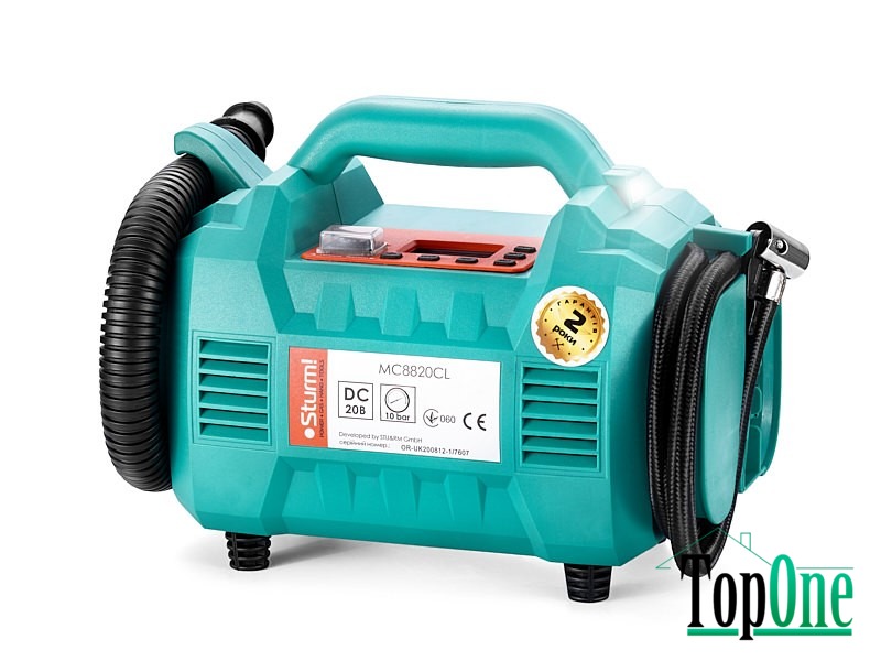 Акумуляторний компресор Sturm MC8820CL - Це компактний інструмент для подачі повітря при накачуванні коліс велосипедів та автомобілів, м'ячів, матраців і т.д. Мала вага дозволяє легко переміщати інструмент. В комплект входять шланг та набір адаптерів. Компресор буде стійкий будь-де, навіть при встановленні на нерівній поверхні. Може легко транспортуватись за рахунок оснащення зручною ручкою. Має досить міцний корпус, що сприяє захисту компресора від потенційних пошкоджень.