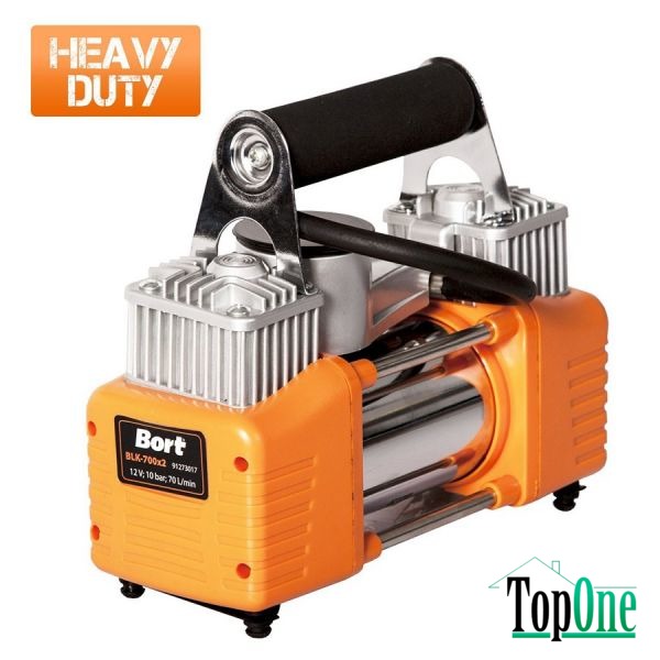 Компресор автомобільний Bort BLK-700х2 дозволить вам з легкістю підкачати шини вашого улюбленого автомобіля, накачати гумовий човен, футбольний м'яч, матрац або басейн. За допомогою цього високоефективного компресора ви зможете виконувати поставлене завдання без перерви протягом 30 хвилин, а це серйозний показник. Потужний двоциліндровий мотор підтримує тиск в 10бар і має високу продуктивність 70л / хв, чого цілком достатньо для накачування автомобільних шин великого розміру і надувного плоту. Компактна сучасна модель оснащена ніжками, які виконують антишумові і антивібраційні функції, що сприяє її комфортному використанню. Завдяки невеликій вазі і ергономічної рукояті, процес транспортування стає легше і зручніше. Спеціальна сумка дозволяє надійно зберігати прилад в будь-якому приміщенні. У комплекті поставляється зі зручною сумкою, шнуром з зажимами - «крокодилами» для підключення до акумулятора 12 В, спіральним шлангом довжиною 5м і манометром.