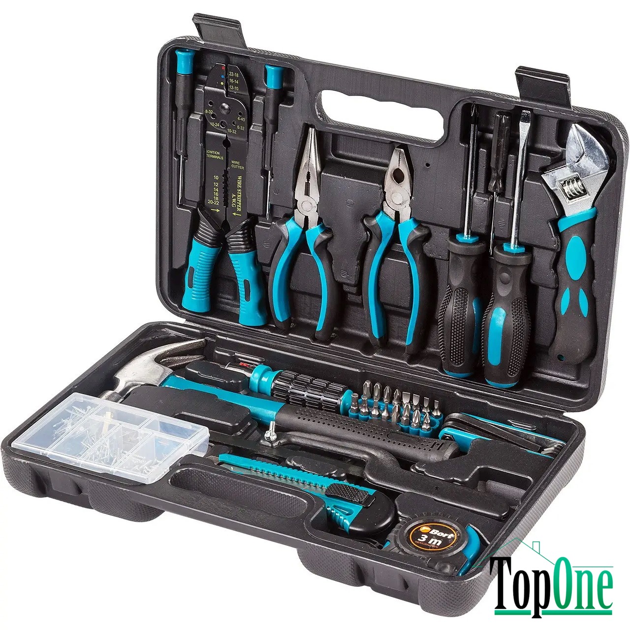 Підбірка комплектуючих включає найнеобхідніше: довгогубці для маніпуляцій з дротом, кліщі для зачистки та обтиску дротів, розвідний ключ, шестигранний ключ у шести розмірах, магнітний тримач, міні-викрутка 50мм для роботи у важкодоступних місцях, молоток, канцелярський ніж, ножівка, орган дрібних деталей і кріплення, 2 викрутки з двокомпонентними міцними ручками, плоскогубці, 2 викрутки для точних робіт з технікою, вимірювальна рулетка на 3 метри, біті 25мм в 16 форматах з викруткою-тримачем.