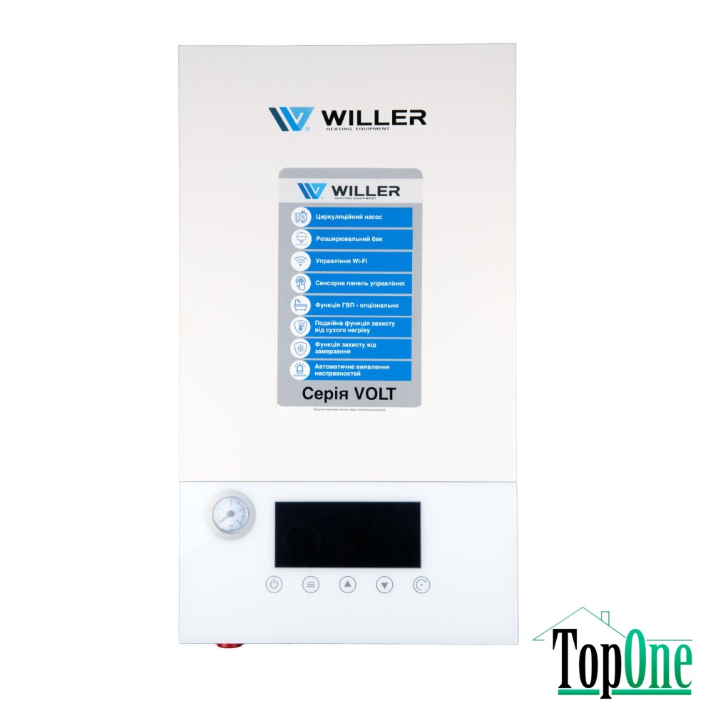 Електрокотел WILLER серії VOLT призначений для опалення приміщень побутового призначення. Запатентована унікальна технологія нагрівального елемента. За допомогою клавіш, розташованих на панелі керування, можна провести регулювання температури опалення та гарячого водопостачання. РК-дисплей на панелі керування дозволяє легко ідентифікувати поточну температуру гарячого водопостачання та системи опалення. Крім актуальної температури на РК-дисплеї відображаються налаштування користувача.