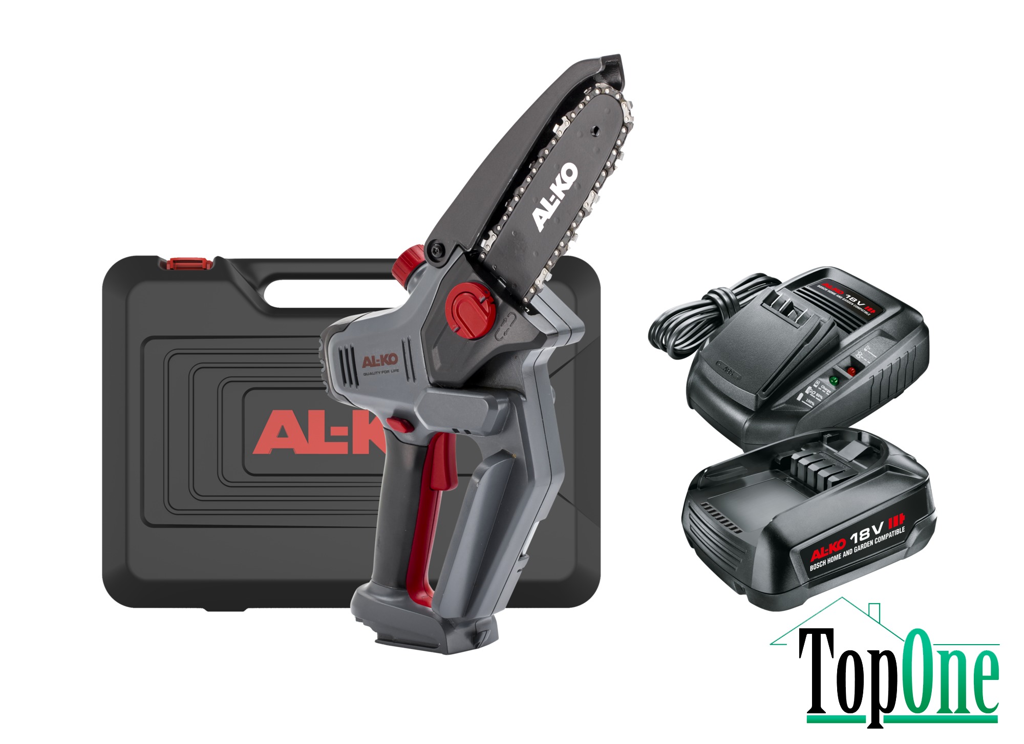 Набір з акумулятором на 2,5 А-год та зарядним пристроєм, оригінальні шина й ланцюг Oregon забезпечують високу ефективність різання й довговічність, натягування ланцюга без інструменту, індикатор заряду акумулятора на пристрої, олива для змащування ланцюга – 30 мл, довжина зрізу – 15 см, товщина зрізу – 13 см, швидкість ланцюга – 7 м/с, приблизна вага – 1,3 кг (без батареї) / 1,6 кг (з батареєю), кейс для транспортування.